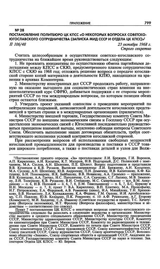 Постановление Политбюро ЦК КПСС «О некоторых вопросах советско-югославского сотрудничества (записка МИД СССР и Отдела ЦК КПСС)». 23 октября 1968 г.