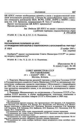 Приложение № 1 к постановлению Политбюро ЦК КПСС «О проведении переговоров о товарообороте с Югославией на 1969 год». Постановление Совета Министров СССР