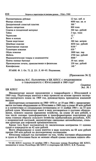 Приложение № 2 к постановлению Политбюро ЦК КПСС «О проведении переговоров о товарообороте с Югославией на 1969 год». Записка Н.С. Патоличева в ЦК КПСС с предложением о товарообороте с Югославией в 1969 году