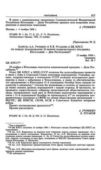 Приложение № 3 к постановлению Политбюро ЦК КПСС «О мероприятиях в Советском Союзе по случаю национального праздника СФРЮ — Дня Республики — 29 ноября». Записка А.А. Громыко и К.В. Русакова в ЦК КПСС по поводу празднования 29 ноября национального праздника Югославии — Дня Республики. 13 ноября 1968 г.