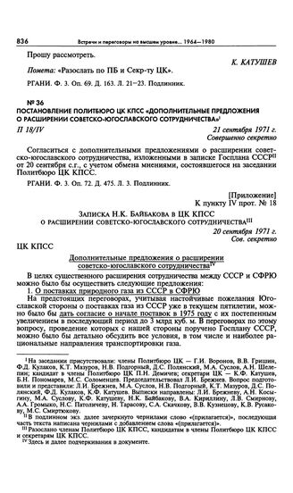 Постановление Политбюро ЦК КПСС «Дополнительные предложения о расширении советско-югославского сотрудничества». 21 сентября 1971 г.