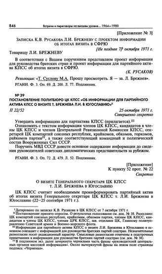 Приложение к постановлению Политбюро ЦК КПСС «Об информации для партийного актива КПСС о визите т. Брежнева Л.И. в Югославию». О визите Генерального секретаря ЦК КПСС т. Л.И. Брежнева в Югославию // РГАНИ. Ф. 3. Оп. 72. Д. 479. Л. 152, 158. Подлинник.