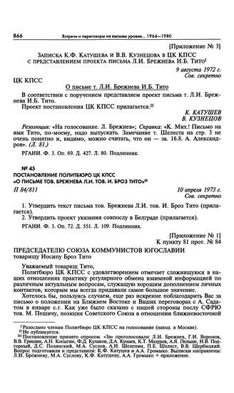 Приложение № 3 к постановлению Политбюро ЦК КПСС «О письме т. Л.И. Брежнева т. И.Б. Тито». Записка К.Ф. Катушева и В.В. Кузнецова в ЦК КПСС с представлением проекта письма Л.И. Брежнева И.Б. Тито. 9 августа 1972 г.