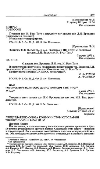 Постановление Политбюро ЦК КПСС «О письме т. И.Б. Тито». 9 июля 1973 г.