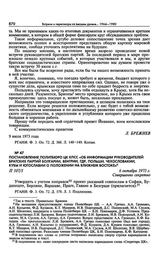 Постановление Политбюро ЦК КПСС «Об информации руководителей братских партий Болгарии, Венгрии, ГДР, Польши, Чехословакии, Кубы и Югославии о положении на Ближнем Востоке». 6 октября 1973 г.