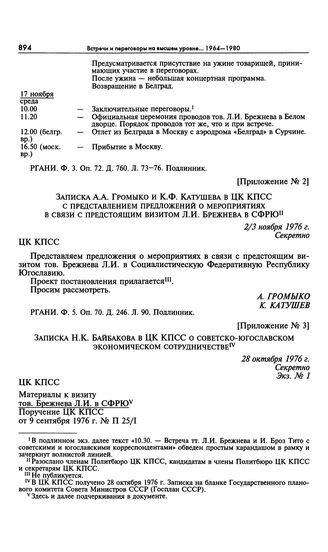 Приложение № 3 к постановлению Политбюро ЦК КПСС «О мероприятиях в связи с визитом тов. Брежнева Л.И. в СФРЮ». Записка Н.К. Байбакова в ЦК КПСС о советско-югославском экономическом сотрудничестве. 28 октября 1976 г. // РГАНИ. Ф. 3. Оп. 70. Д. 246. Л. 95-105. Подлинник.