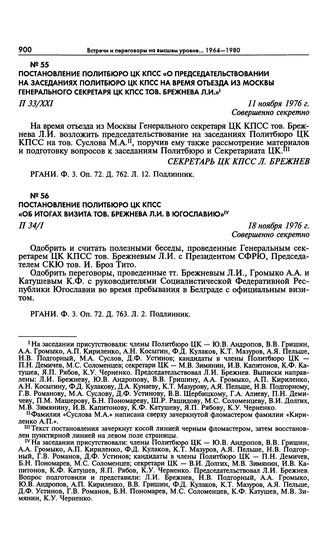 Постановление Политбюро ЦК КПСС «О председательствовании на заседаниях Политбюро ЦК КПСС на время отъезда из Москвы Генерального секретаря ЦК КПСС тов. Брежнева Л.И.». 11 ноября 1976 г.