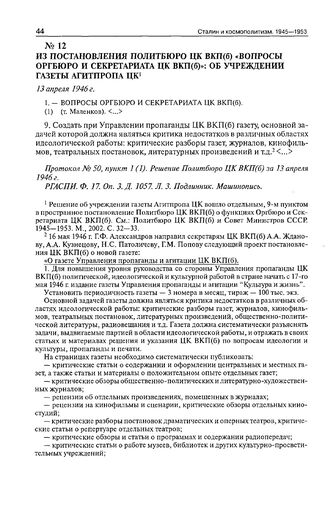 Из постановления Политбюро ЦК ВКП(б) «Вопросы Оргбюро и Секретариата ЦК ВКП(б)»: об учреждении газеты Агитпропа ЦК. 13 апреля 1946 г.