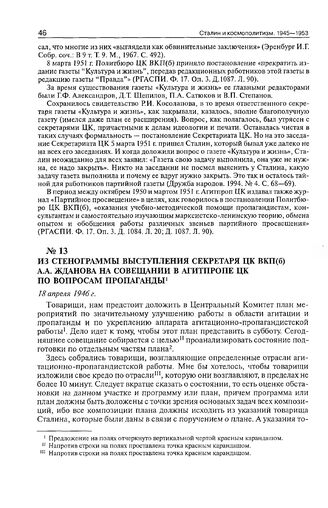 Из стенограммы выступления секретаря ЦК ВКП(б) А.А. Жданова на совещании в Агитпропе ЦК по вопросам пропаганды. 18 апреля 1946 г.