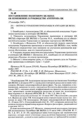 Постановление Политбюро ЦК ВКП(б) об изменениях в руководстве Агитпропа ЦК. 17 сентября 1947 г. // РГАСПИ. Ф. 17. Оп. 3. Д. 1066. Л. 48. Подлинник. Машинопись. Опубликовано: Политбюро ЦК ВКП(б) и Совет Министров СССР. 1945-1953. М., 2002. С. 51-52.