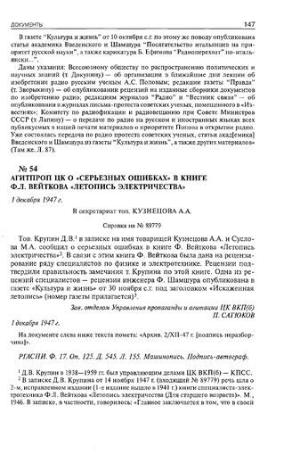 Агитпроп ЦК о «серьезных ошибках» в книге Ф.Л. Вейткова «летопись электричества». 1 декабря 1947 г.