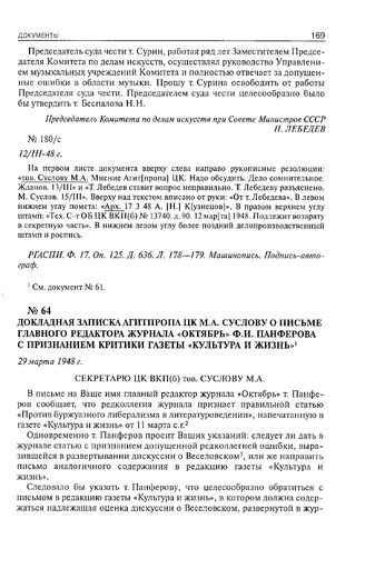 Докладная записка Агитпропа ЦК М.А. Суслову о письме главного редактора журнала «Октябрь» Ф.И. Панферова с признанием критики газеты «Культура и жизнь». 29 марта 1948 г.