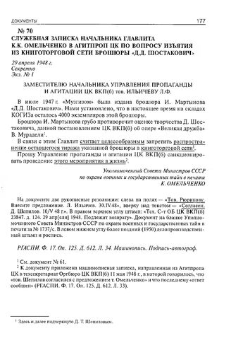 Служебная записка начальника Главлита К.К. Омельченко в Агитпроп ЦК по вопросу изъятия из книготорговой сети брошюры «Д.Д. Шостакович». 29 апреля 1948 г. // РГАСПИ. Ф. 17. Оп. 125. Д. 612. Л. 34. Машинопись. Подпись-автограф.