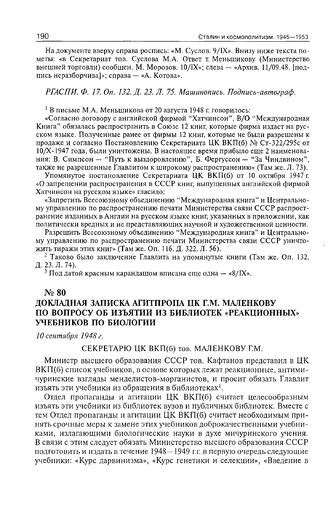 Докладная записка Агитпропа ЦК Г.М. Маленкову по вопросу об изъятия из библиотек «реакционных» учебников по биологии. 10 сентября 1948 г. // РГАСПИ. Ф. 17. Оп. 132. Д. 66. Л. 20. Машинопись Подписи-автографы.