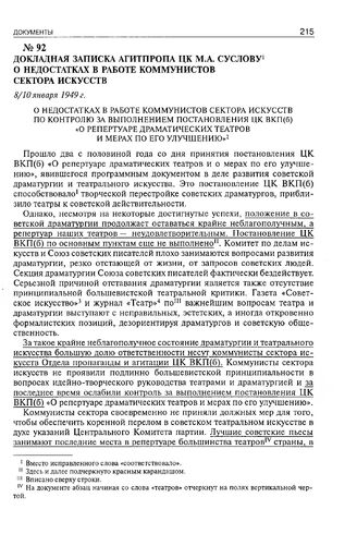 Докладная записка Агитпропа ЦК М.А. Суслову о недостатках в работе коммунистов сектора искусств. 8/10 января 1949 г. // РГАСПИ. Ф. 17. Оп. 132. Д. 237. Л. 57-61. Копия. Машинопись с рукописной правкой.