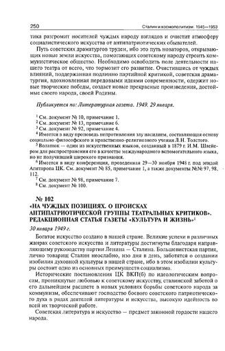 На чуждых позициях. о происках антипатриотической группы театральных критиков. Редакционная статья газеты «Культура и жизнь». 30 января 1949 г. // Публикуется по: Культура и жизнь. 1949. 30 января.