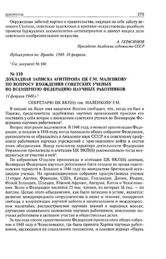 Докладная записка Агитпропа ЦК Г.М. Маленкову по вопросу вхождения советских ученых во Всемирную Федерацию научных работников. 11 февраля 1949 г.