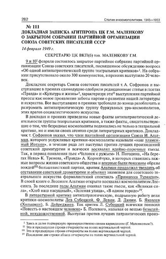 Докладная записка Агитпропа ЦК Г.М. Маленкову о закрытом собрании партийной организации Союза Советских писателей СССР. 14 февраля 1949 г.