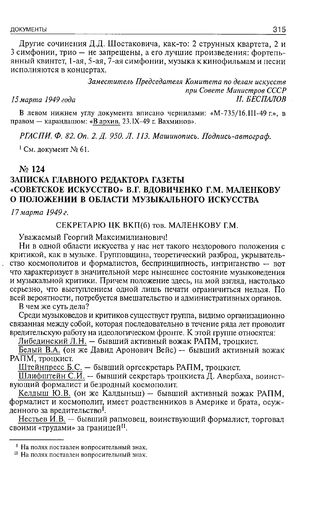 Записка главного редактора газеты «Советское искусство» В.Г. Вдовиченко Г.М. Маленкову о положении в области музыкального искусства. 17 марта 1949 г. // РГАСПИ. Ф. 17. Оп. 132. Д. 244. Л. 36-39. Машинопись. Подпись-автограф.