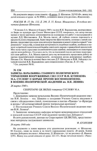 Записка начальника Главного политического Управления Вооруженных сил СССР Ф.Ф. Кузнецова М.А. Суслову о борьбе против космополитизма в Военно-Политической академии им. В.И. Ленина. 26 марта 1949 г.