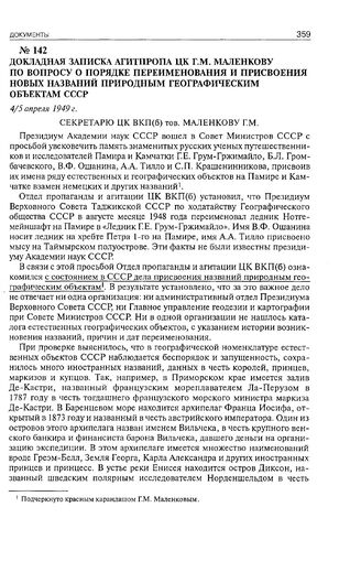 Докладная записка Агитпропа ЦК Г.М. Маленкову по вопросу о порядке переименования и присвоения новых названий природным географическим объектам СССР. 4/5 апреля 1949 г.