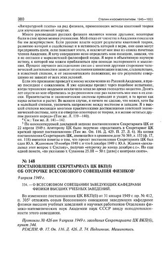 Постановление Секретариата ЦК ВКП(б) об отсрочке Всесоюзного совещания физиков. 9 апреля 1949 г. // РГАСПИ. Ф. 17. Оп. 116. Д. 426. Л. 74. Подлинник. Машинопись.