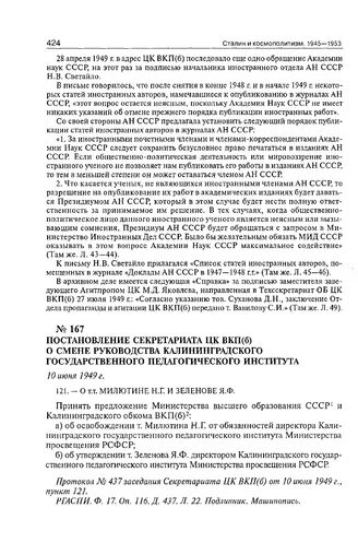 Постановление Секретариата ЦК ВКП(б) о смене руководства Калининградского Государственного педагогического института. 10 июня 1949 г.