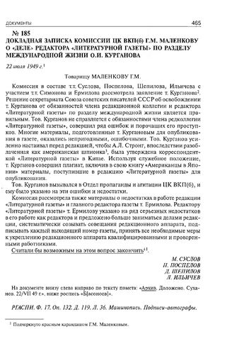 Докладная записка комиссии ЦК ВКП(б) Г.М. Маленкову «о деле» редактора «Литературной газеты» по разделу международной жизни О.И. Курганова. 22 июля 1949 г.
