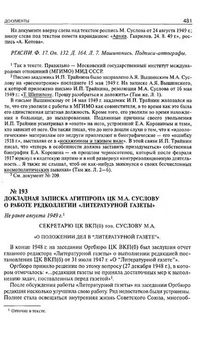 Главная Серия «Россия. XX век. Документы» Сталин и космополитизм. 1945-1953: Док. Агитпропа ЦК КПСС Докладная записка Агитпропа ЦК М.А. Суслову о работе редколлегии «Л...