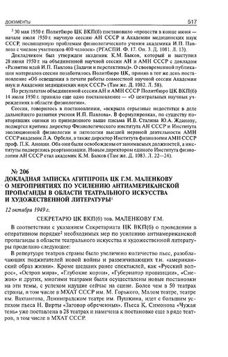 Докладная записка Агитпропа ЦК Г.М. Маленкову о мероприятиях по усилению антиамериканской пропаганды в области театрального искусства и художественной литературы. 12 октября 1949 г.