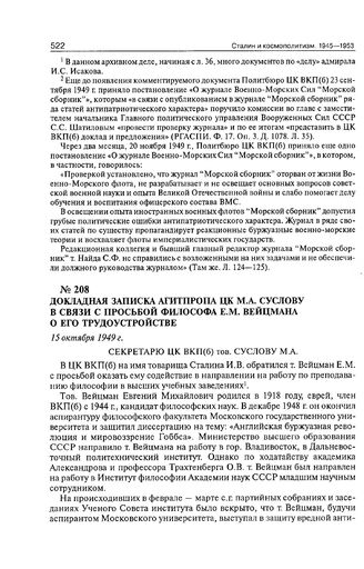 Докладная записка Агитпропа ЦК М.А. Суслову в связи с просьбой философа Е.М. Вейцмана о его трудоустройстве. 15 октября 1949 г.