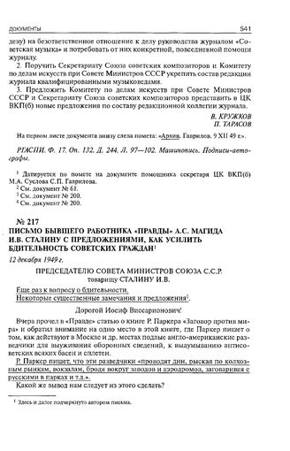 Письмо бывшего работника «Правды» А.С. Магида И.В. Сталину с предложением, как усилить бдительность советских граждан. 10 декабря 1949 г. // РГАСПИ. Ф. 17. Оп. 132. Д. 116. Л. 93-102. Рукопись. Подпись-автограф.