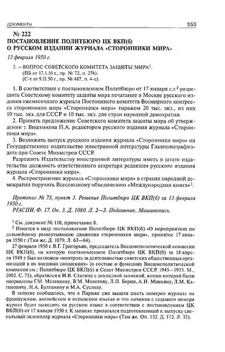 Постановление Политбюро ЦК ВКП(б) о русском издании журнала «Сторонники мира». 13 февраля 1950 г. // РГАСПИ. Ф. 17. Оп. 3. Д. 1080. Л. 2-3. Подлинник. Машинопись.
