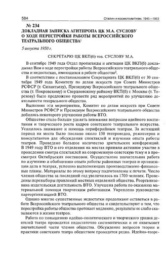 Докладная записка Агитпропа ЦК М.А. Суслову о ходе перестройки работы Всероссийского театрального общества. 5 августа 1950 г. // РГАСПИ. Ф. 17. Оп. 132. Д. 411. Л. 72-73. Машинопись. Подписи-автографы.