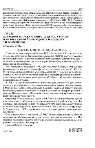 Докладная записка Агитпропа ЦК М.А. Суслову о жалобе бывшей преподавательницы ЛГУ З.Н. Мелещенко. 28 октября 1950 г. // РГАСПИ. Ф. 17. Оп. 132. Д. 382. Л. 246. Машинопись. Подписи-автографы.