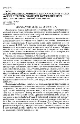 Докладная записка Агитпропа ЦК М.А. Суслову об итогах «общей проверки» работников Государственного издательства иностранной литературы. 2/4 ноября 1950 г.