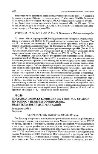 Докладная записка комиссии ЦК ВКП(б) М.А. Суслову по вопросу цензуры официальных правительственных публикаций. 30 августа 1951 г.