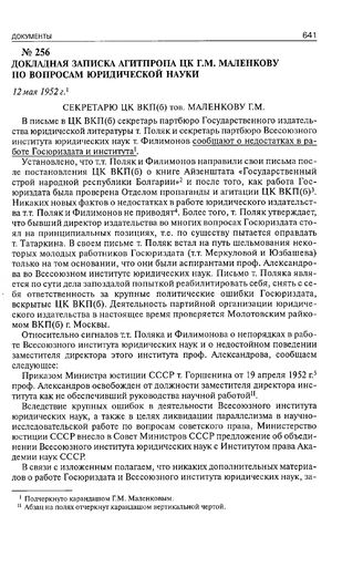 Докладная записка Агитпропа ЦК Г.М. Маленкову по вопросам юридической науки. 12 мая 1952 г. // РГАСПИ. Ф. 17. Оп. 132. Д. 541. Л. 47-48. Машинопись. Подписи-автографы.