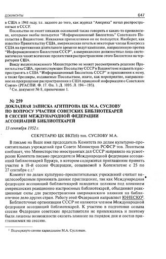 Докладная записка Агитпропа ЦК М.А. Суслову по вопросу участия советских библиотекарей в сессии Международной федерации ассоциаций библиотекарей. 13 сентября 1952 г. // РГАСПИ. Ф. 17. Оп. 132. Д. 565. Л. 49. Машинопись. Подписи-автографы.