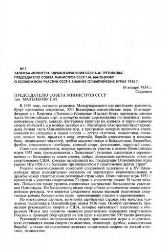 Записка министра здравоохранения СССР А.Ф. Третьякова председателю Совета Министров СССР Г.М. Маленкову о возможном участии СССР в зимних Олимпийских играх 1956 г. 16 января 1954 г. // РГАНИ. Ф. 5. Оп. 21. Д. 587. Л. 50-52. Подлинник.