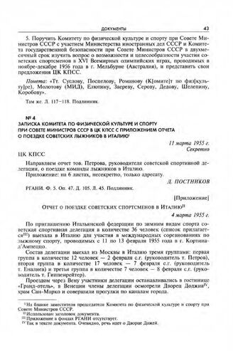 Записка Комитета по физической культуре и спорту при Совете Министров СССР в ЦК КПСС с приложением отчета о поездке советских лыжников в Италию. 11 марта 1955 г. // РГАНИ. Ф. 5. Оп. 47. Д. 105. Л. 45. Подлинник.