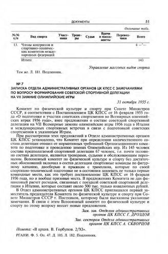 Записка Отдела административных органов ЦК КПСС с замечаниями по вопросу формирования советской спортивной делегации на VII зимние Олимпийские игры. 31 октября 1955 г.