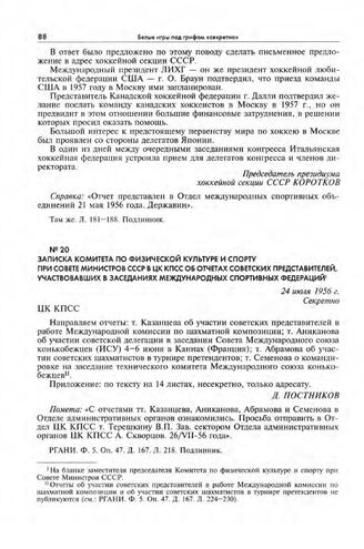 Записка Комитета по физической культуре и спорту при Совете Министров СССР в ЦК КПСС об отчетах советских представителей, участвовавших в заседаниях международных спортивных федераций. 24 июля 1956 г. // РГАНИ. Ф. 5. Оп. 47. Д. 167. Л. 218. Подлинник.