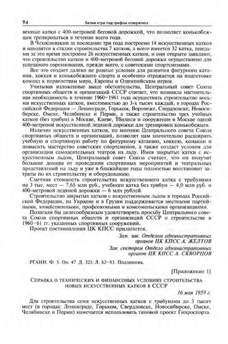 Приложение 1 к записке Отдела административных органов ЦК КПСС. Справка о технических и финансовых условиях строительства новых искусственных катков в СССР. 16 мая 1959 г.