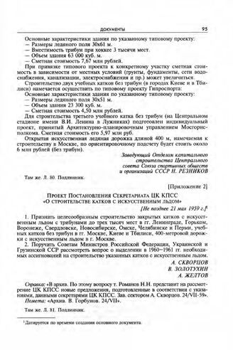 Приложение 2 к записке Отдела административных органов ЦК КПСС. Проект постановления Секретариата ЦК КПСС «О строительстве катков с искусственным льдом». [Не позднее 21 мая 1959 г.] // РГАНИ. Ф. 5. Оп. 47. Д. 323. Л. 81. Подлинник.