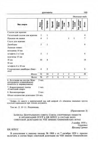 Приложение 3 к записке Центрального совета Союза спортивных обществ и организаций СССР в ЦК КПСС. Записка Центрального совета Союза спортивных обществ и организаций СССР в ЦК КПСС о составе бюро советской делегации на VIII зимних Олимпийских играх. 2 ноября 1959 г.