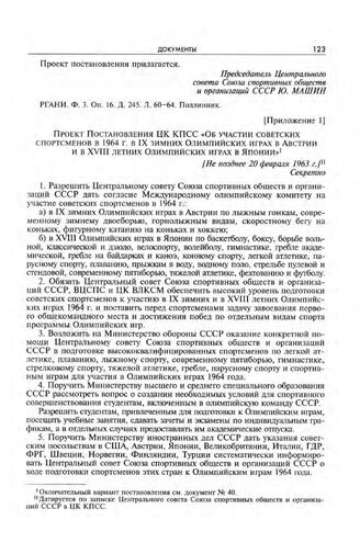 Приложение 1 к записке Центрального совета Союза спортивных обществ и организаций СССР в ЦК КПСС. Проект постановления ЦК КПСС «Об участии советских спортсменов в 1964 г. в IX зимних Олимпийских играх в Австрии и в XVIII летних Олимпийских играх в Японии». [Не позднее 20 февраля 1963 г.] // РГАНИ. Ф. 3. Оп. 16. Д. 245. Л. 65-66. Подлинник.