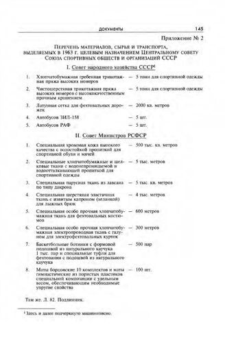 Приложение № 2 к проекту постановления Совета Министров СССР. Перечень материалов, сырья и транспорта, выделяемых в 1963 г. целевым назначением Центральному совету Союза спортивных обществ и организаций СССР // РГАНИ. Ф. 3. Оп. 16. Д. 245. Л. 82. Подлинник.Подлинник.