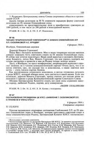 Постановление Президиума ЦК КПСС «Заявление т. Скобликовой Л.П. о приеме ее в члены КПСС». 6 февраля 1964 г.