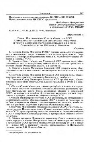 Приложение 1 к записке Центрального совета Союза спортивных обществ и организаций СССР в ЦК КПСС. Проект постановления Совета Министров СССР «О материально-техническом обеспечении подготовки и участия советской спортивной делегации в X зимних Олимпийских играх 1968 года во Франции»